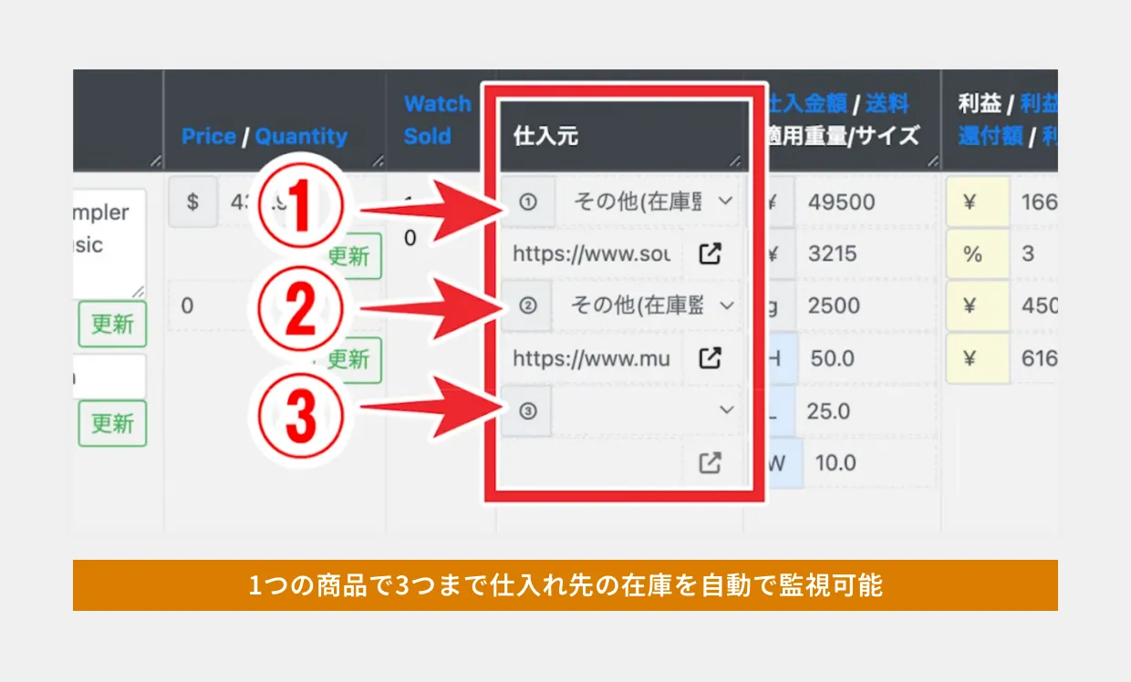 12サイトの在庫を24時間自動監視。 在庫切れを検知したら即アラート&eBay側の数量を0に自動変更。