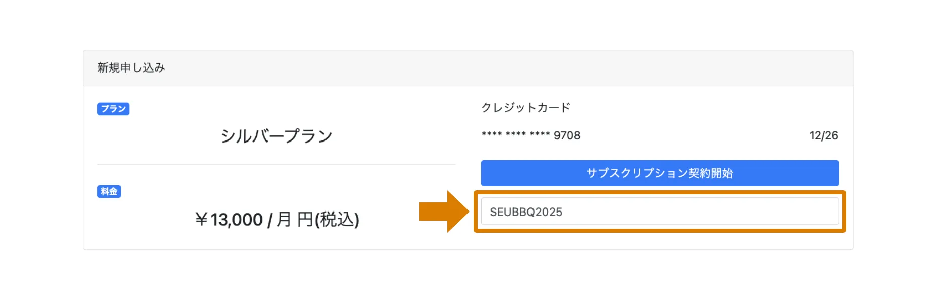 以下のクーポンコードを入力して「適用」ボタンを押してください。入力を忘れると、通常の1か月無料となり、2か月無料特典が受けられませんのでご注意ください。